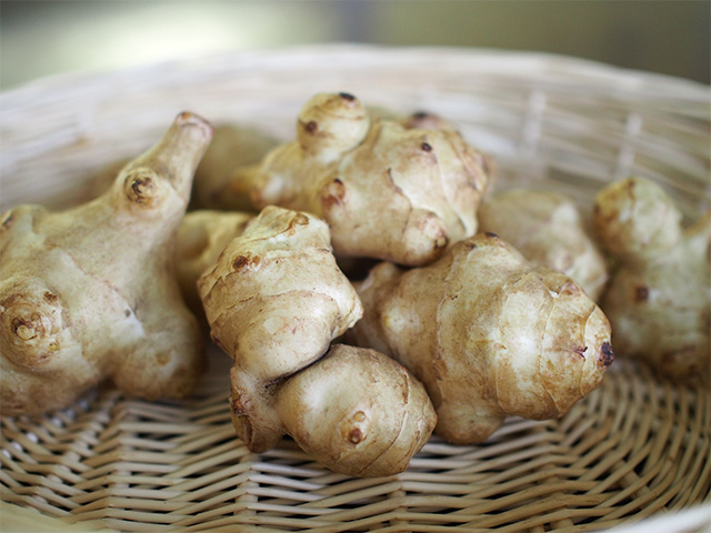 菊芋は北米原産のキク科ヒマワリ属の多年草で、秋に黄色の花を咲かせ、地下の茎の部分が膨らんだ塊茎(かいけい)を食用とします。日本には江戸末期に伝わり、凶作に備える作物として普及しました。  菊芋には芋の主成分とされるデンプンがほとんど含まれておらず、低糖質・低カロリーであることから糖質制限やダイエットに適した野菜として、注目が高まっています。  生で食べると、「レンコン」のようなシャキシャキした歯ごたえでクセがないのが特徴です。