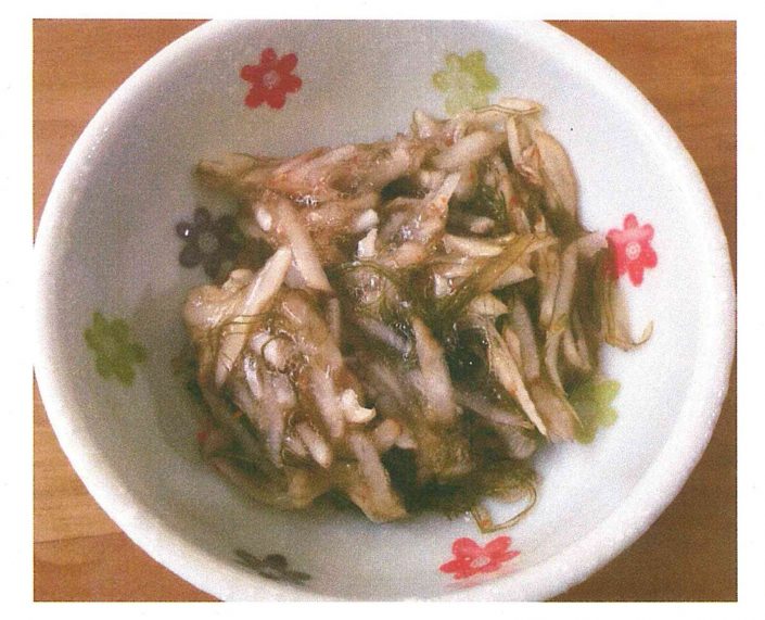 1)菊芋をせん切り器でカットする。水で戻したがごめ昆布を混ぜて、めんつゆ小さじ1、とうがらし少々を加える。